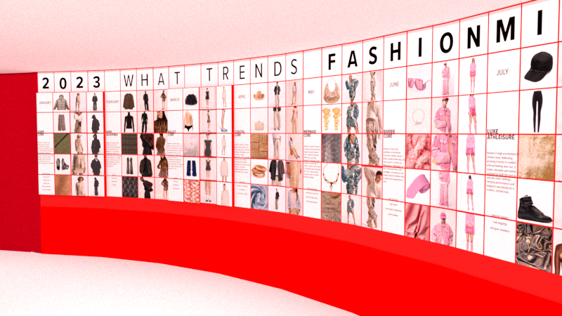 Section 1 Trend Timeline The display spans the year of 2023, from GropeCore in January to Embellished Tailoring in December, showing how each fleeting trend emerges, dominates, and quickly fades. Capturing a culture in constant motion.