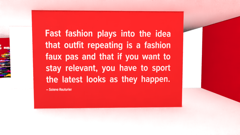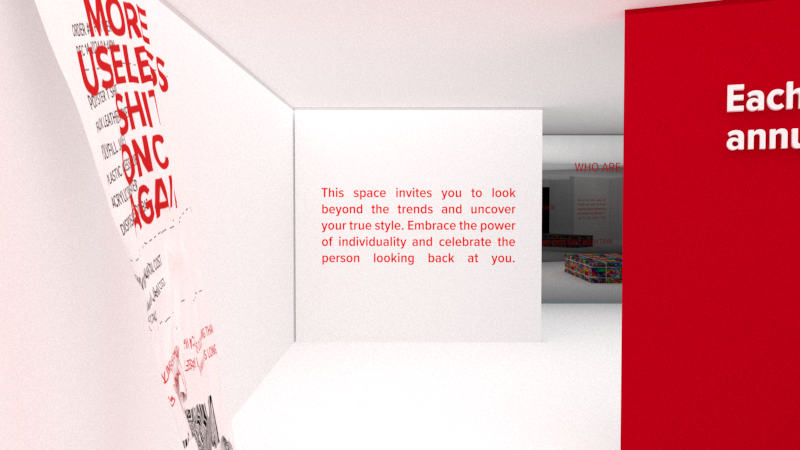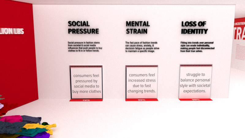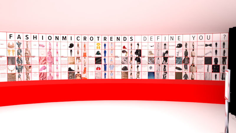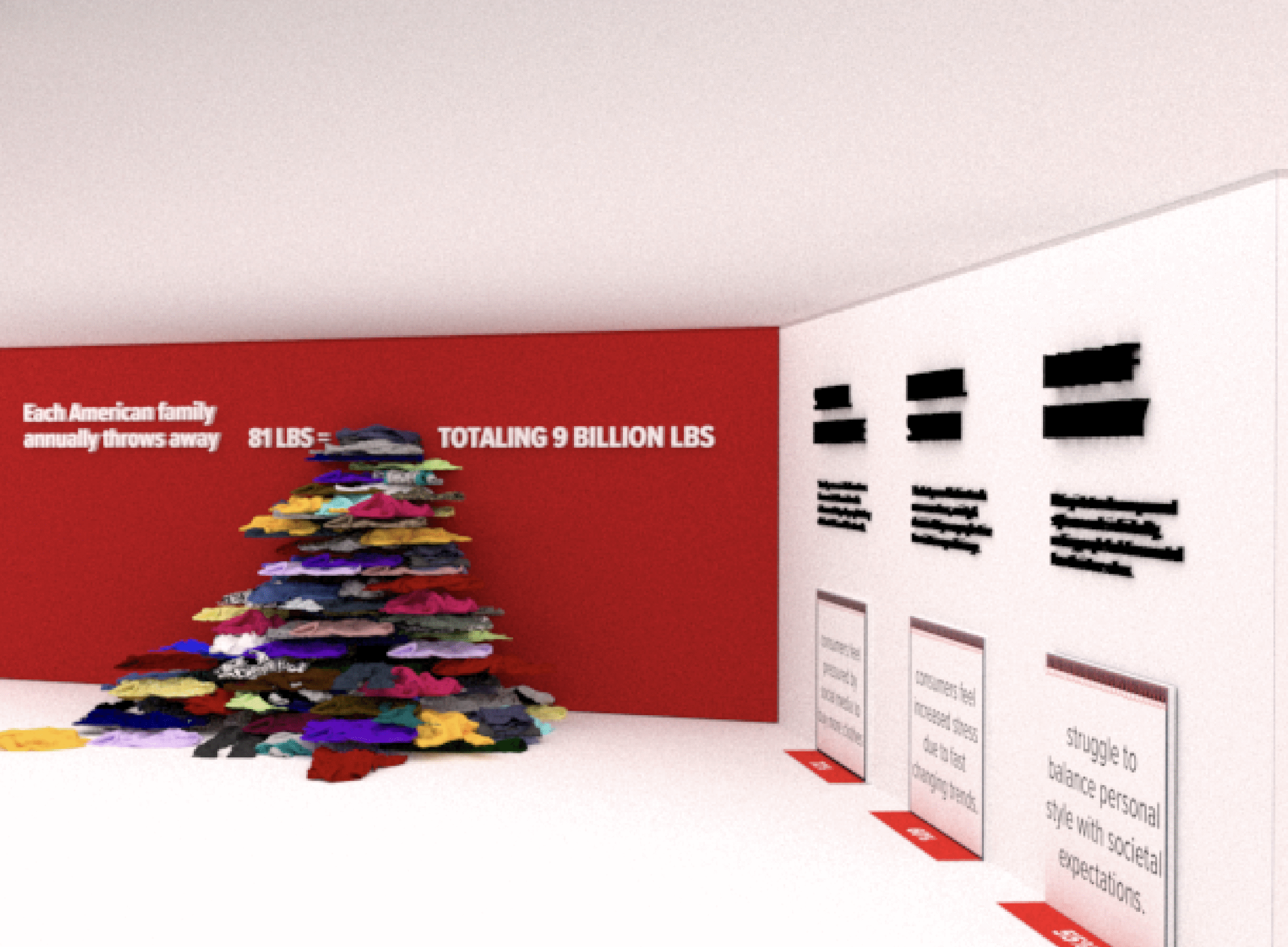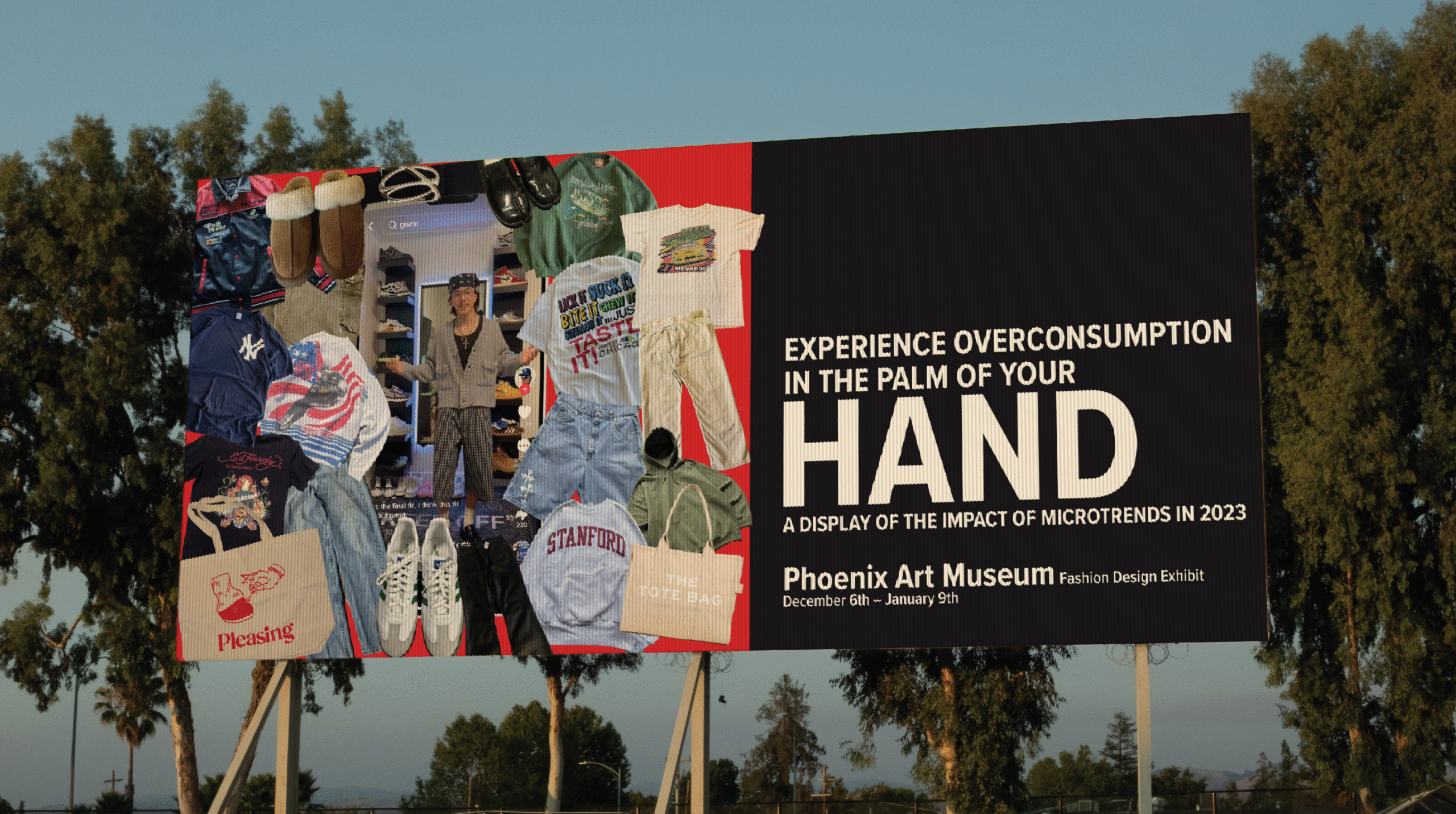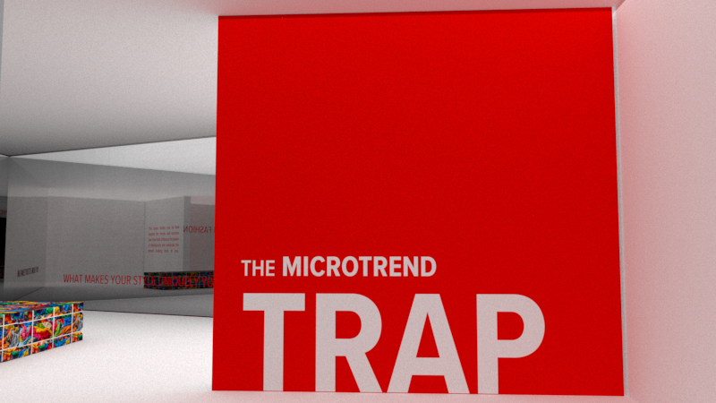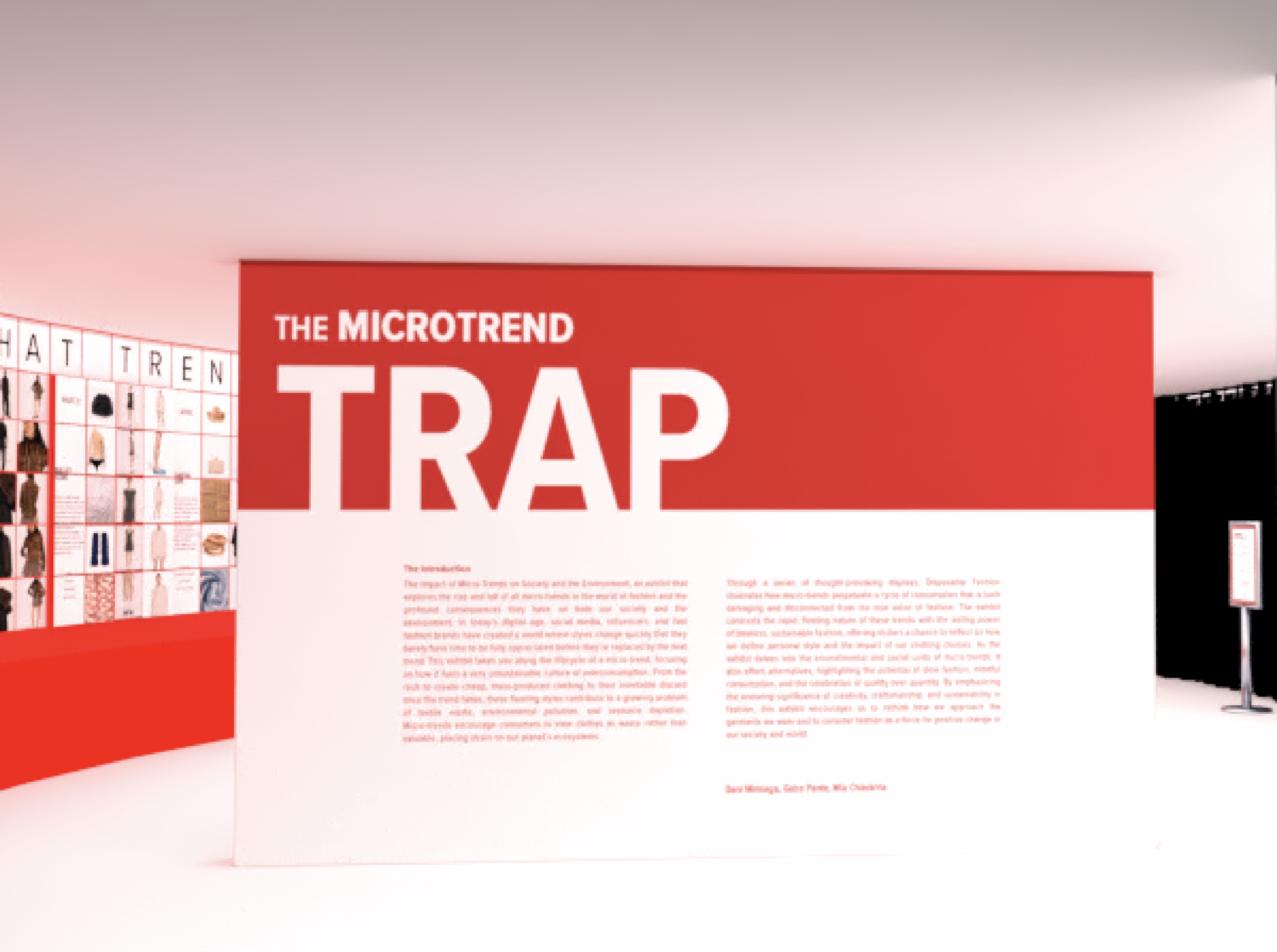 The MicroTrend Trap exhibit explores the impact of 2023 fashion microtrends, uncovering the cultural, environmental, and personal costs they leave behind. The exhibit invites visitors to see how social media and fast fashion accelerate trend cycles, question the pressures of conformity and embrace, lasting personal style. The key takeaway is style is not defined by trends, & chasing microtrends leads to overconsumption. Embrace what makes you, you. In collaboration with two classmates in the design program. (Mia Chavarria & Gabe Pante)